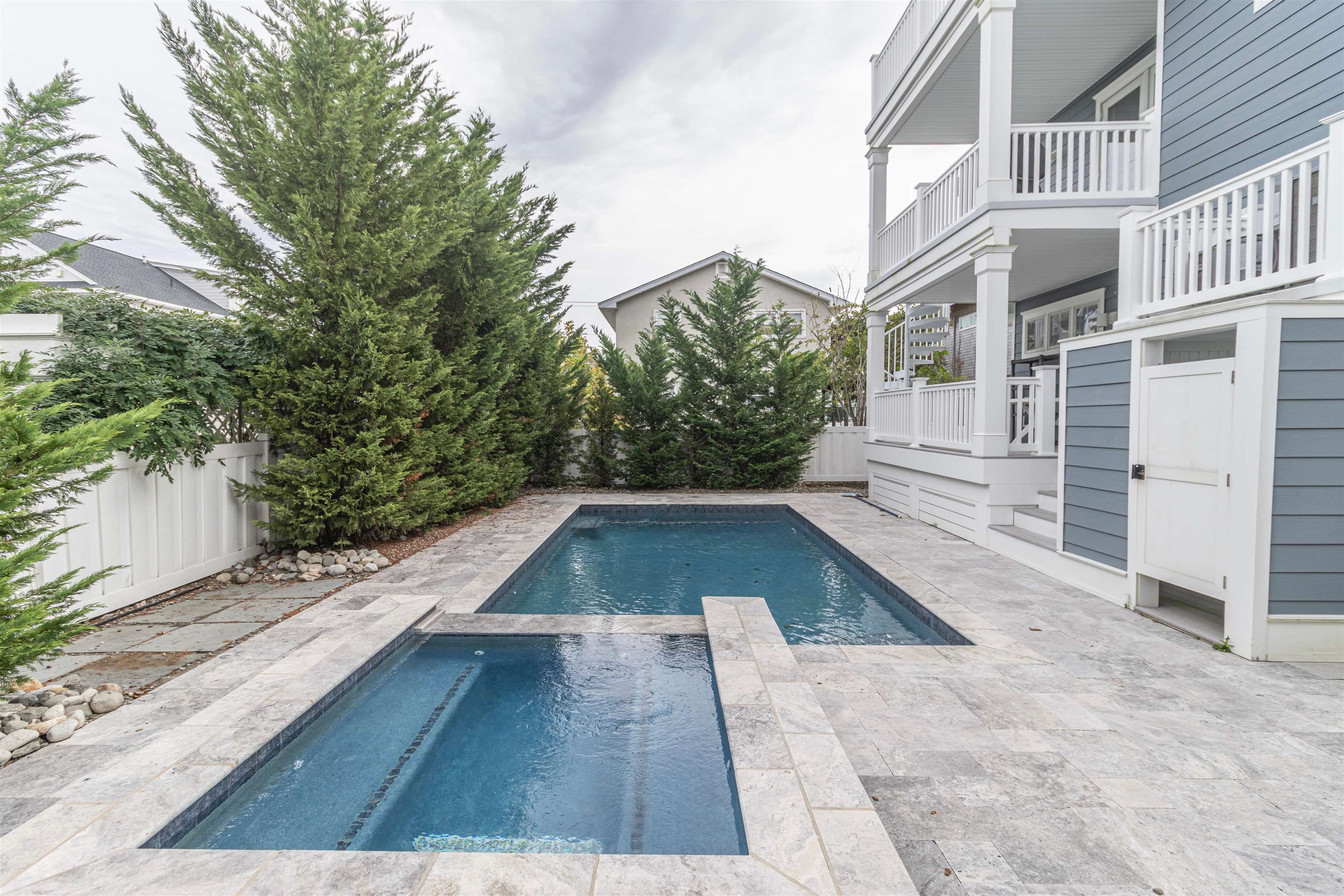 This centrally located and impeccably maintained home delivers white-water ocean views that rival many oceanfront properties. Thanks to the unusually low dune elevation on 32nd Street and a recessed south-side oceanfront parcel west of Avalon Avenue, the property enjoys sweeping, unobstructed view corridors. Built in 2017, the 3,800-square-foot residence offers six spacious bedrooms, generous entertaining areas, and extraordinary decks on both the front and rear. A wide covered porch opens to a welcoming foyer and three first-floor bedrooms, two full bathrooms, and a rear family room with a custom wet bar. This space flows seamlessly outdoors to a private backyard retreat featuring a covered deck, oversized pool with separate hot tub, travertine hardscaping, and lush landscaping for total privacy. Upstairs, a vaulted great room centers around a gas fireplace and captures breathtaking ocean views. The chef s kitchen is outfitted with stainless steel appliances, custom cabinetry, and a large center island, while the adjacent dining area leads to a rear deck with grill station and spiral stair to the pool level. The expansive second-floor front deck easily accommodates multiple entertaining areas, each offering panoramic views. The third floor features two en-suite bedrooms, including a luxurious primary suite. Additional highlights include a three-stop elevator, wide-plank hardwood floors throughout, and privacy shades on the second-floor decks. A side storage garage with automatic roll down makes storing all of your bikes and beach toys easy. Located just steps from the 32nd Street beach path and only a short walk into Avalon s vibrant shopping and dining district, this property combines exceptional views, premier amenities, and unmatched convenience. With ample parking for family and guests, this home is a rare opportunity to enjoy Avalon at its very best.